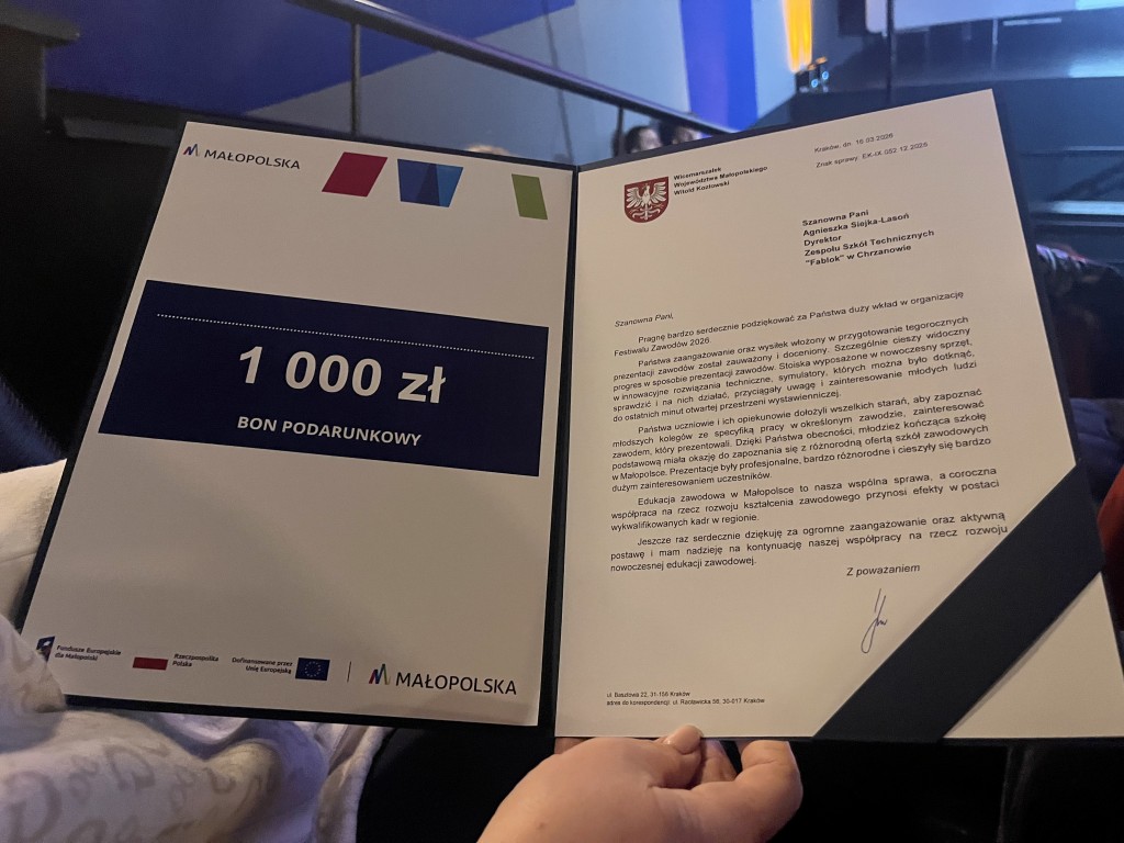 Nagrodę za aktywny udział w Festiwalu Zawodów - bon podarunkowy o wartości 1000 zł - odebrała Dyrektor ZST "FABLOK" Pani Agnieszka Siejka-Lasoń.